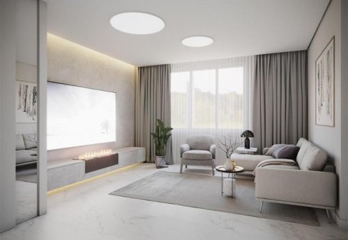 Продуманное освещение: Интеграция любых типов светильников (точечных, линейных, подвесных), установство световых линий и теневых карнизов для создания уникальной световой атмосферы.